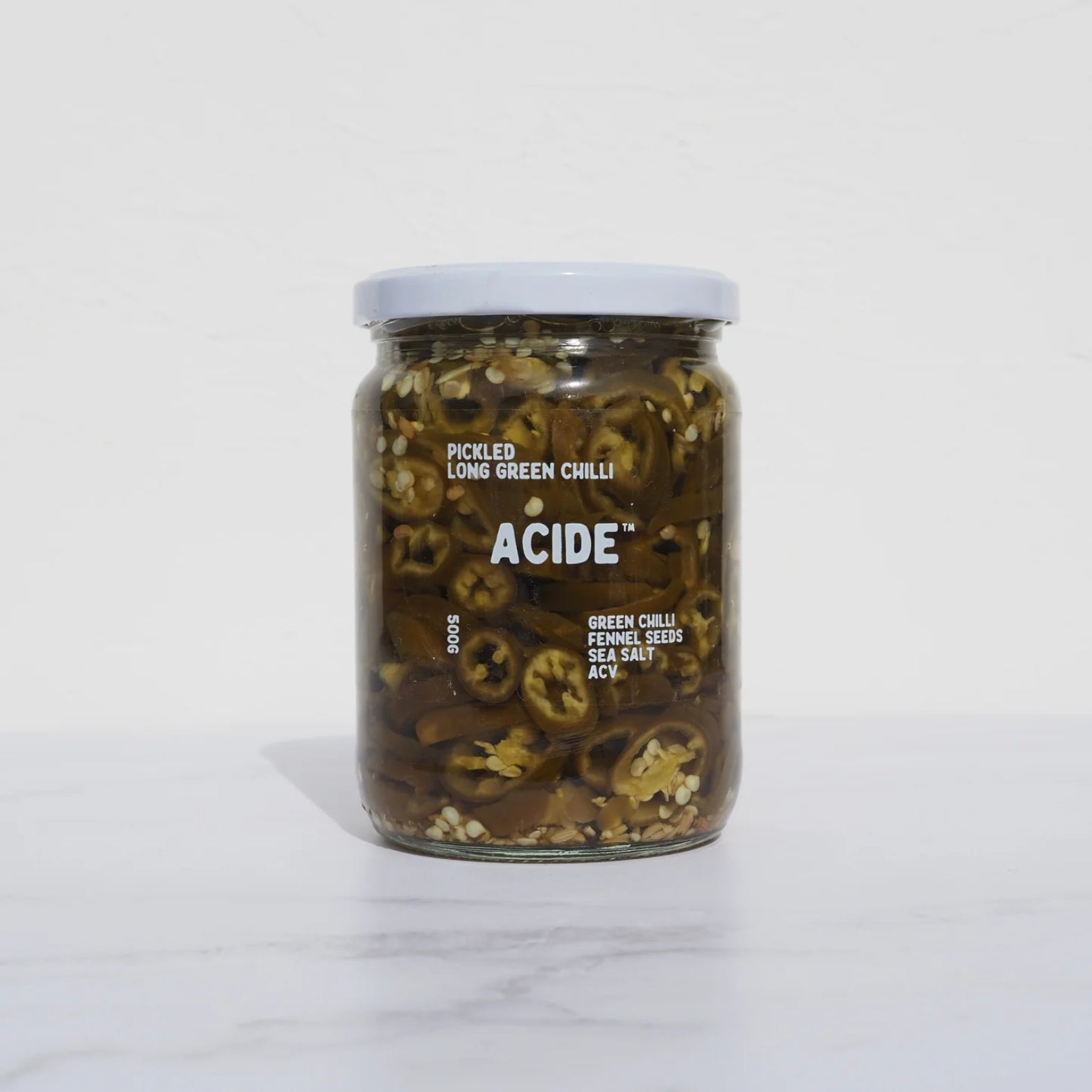 ACIDE's Pickled Long Green Chillis are a fiery and flavourful addition to any dish that needs an extra kick. Made with fresh, plump green chilies that have been carefully selected for their heat and flavour, each jar is filled with sliced long green chili peppers that have been pickled in a tangy and spicy brine of vinegar, salt, and herbs. Enjoy it as a condiment for burgers, tacos, or sandwiches, or use it to add some heat and zing to your favourite chilli or soup.