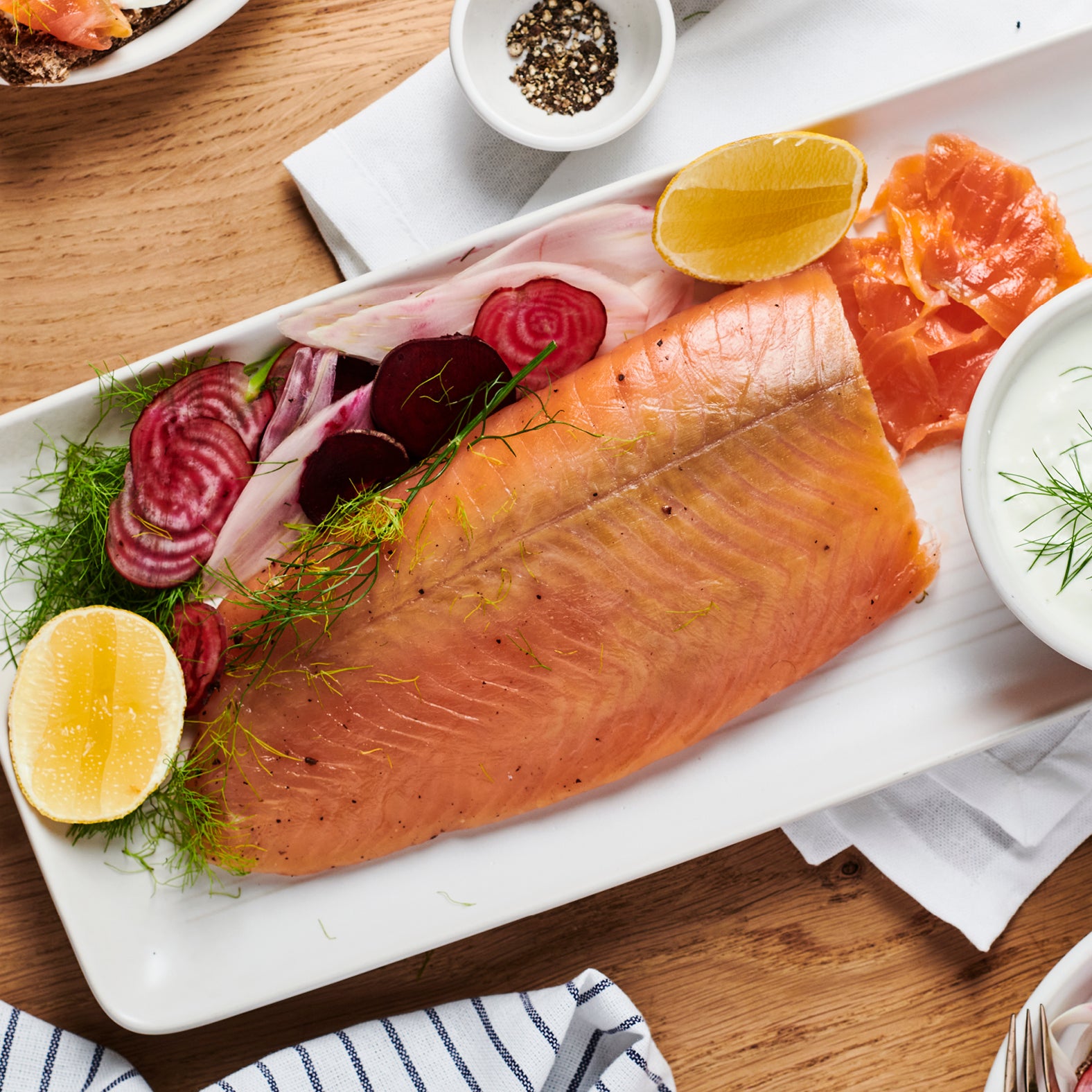 BEETROOT & VODKA CURED OCEAN TROUT GRAVLAX, HORSERADISH CREAM.