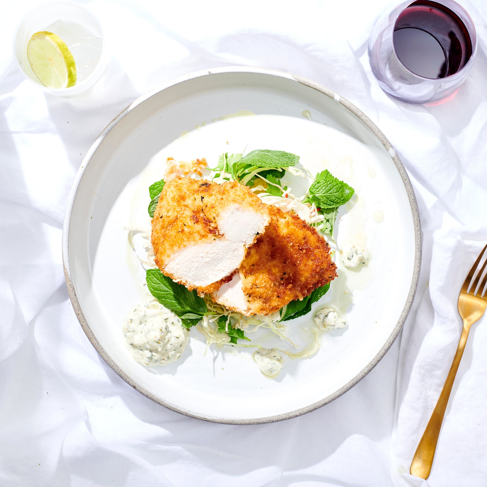 Free-range chicken schnitzels with Greek style lemon potatoes and a crisp broccoli and cabbage slaw. A perfectly balanced plate. Ready to heat, serve and enjoy.