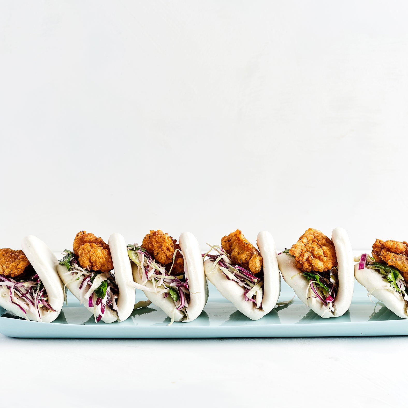 POPCORN CHICKEN BAO, CHIPOTLE MAYO, CABBAGE SLAW, PICKLED CUCUMBER (30)