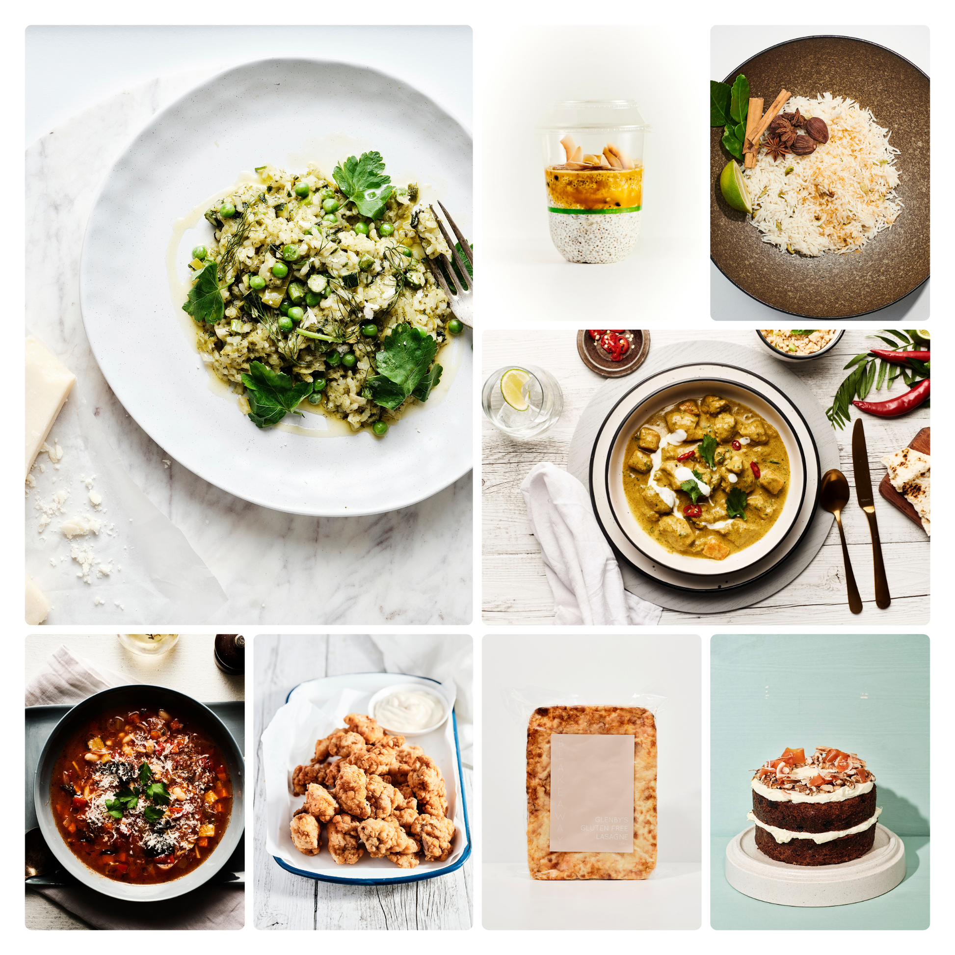 Delicious gluten-free eating without compromise. This hamper delivers eight ready-made essentials. Seasonal Chia Pudding, hearty Minestrone, creamy Seasonal Risotto, fragrant Sri Lankan Chicken Curry with Fragrant Rice, crispy Buttermilk Fried Popcorn Chicken with Chipotle Mayo, GF Lasagne, and indulgent GF Carrot Cake. Full flavour, zero gluten. Perfect for gluten-sensitive diets or anyone seeking quality gluten-free meals ready to heat and enjoy.